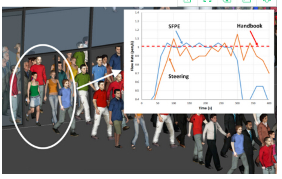 -除了3D模拟视图,Pathfinder还提供了2D时间关系曲线图的CSV文件和记录楼层疏散时间和出入口流通率的文本文件。
